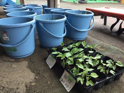 先月末に、みどりの日のイベントで副園長が入手した種をもらって、自宅で育苗していたのを今日園に持って来ました。ゴーヤと朝顔です。子どもたちとうまく育てて、チャボの卵も使ったチャンプルを作って美味しく頂きたいです。後方のバケツは、昨日、年少以下のクラスでバケツ稲を仕立てました。